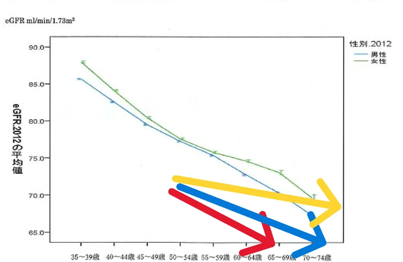 具体的な例でいうと、腎機能があげられます。 腎臓は体に蓄積された毒物(代謝物など)を排泄して尿にして流し、体を維持しています。 この腎臓の機能を表すGFRという値が重要なのですが、加齢とともに低下していきます。2)
