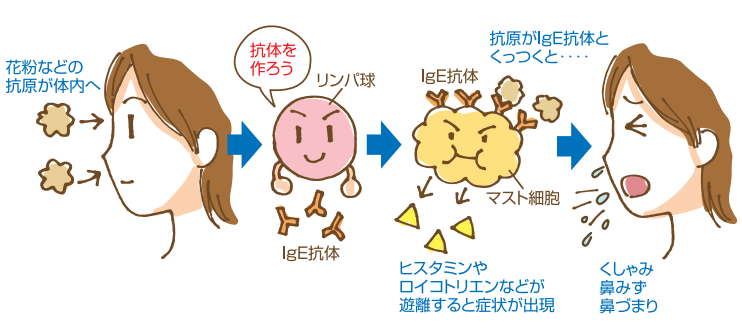 アレルギーの対象となっている物質(抗原)が侵入すると、異物をパトロールしているリンパ球という細胞からIgEという抗体が作られます。これがマスト細胞の受容体(鍵穴のようなもの)にくっつくと、ヒスタミンやロイコトリエンを放出し、症状を引き起こします。